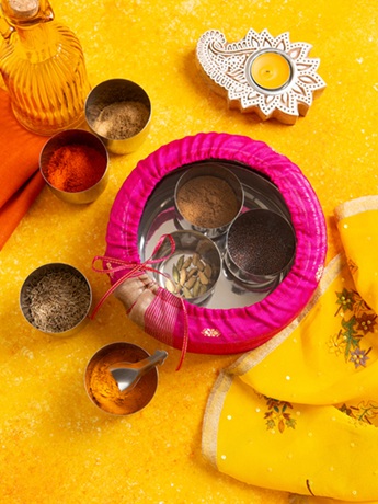 - Indian spice tins (Dabbas) containing 7 different spices and a measuring spoon