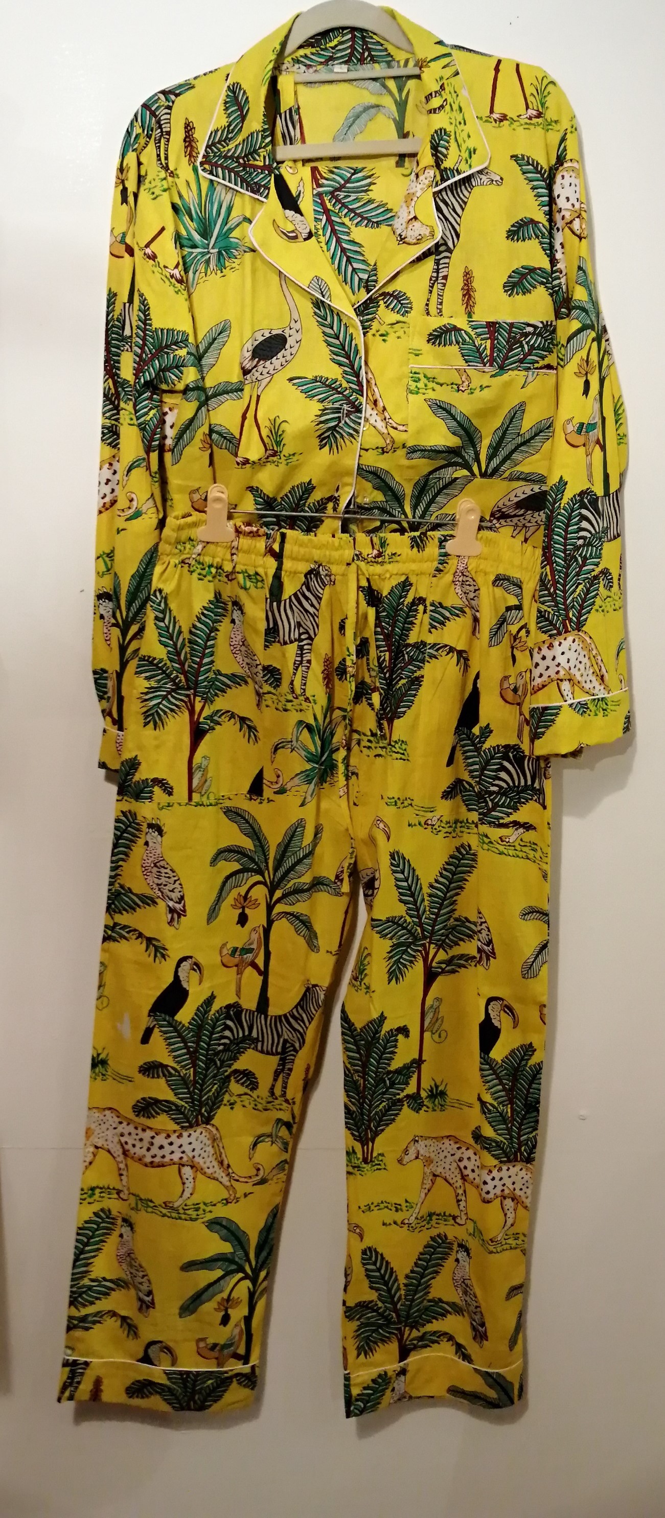 We have a selection of clothes and lounging ware. Cotton pyjamas and robes in vibrant animal print
